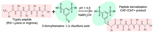 Figure 2. Derivatization procedure of tryptic peptide with CAF-/CAF+ reagent (5-formylbenzene-1,3-disulfonic acid).