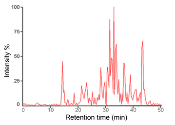 Set the spotter make-up flow to 2 μL/min (5 mg α-Cyano-4-hydroxycinnamic acid matrix dissolved in 1 mL of 50% ACN aqueous solution). Example of typical LC-MALDI chromatogram is shown in Figure 3.
