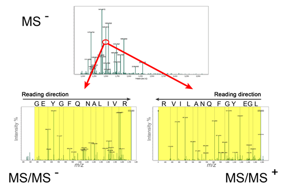 By depleted MS/MS spectra derived out of derivatized peptides (only b-ions in negative ion mode and y-ions in positive ion mode are observed in MS/MS) peptide sequences can be read by specific software named ProteinReader (Figure 4).
